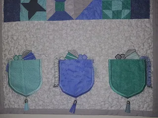 I finished quilting this project. I did free motion, ruler work and some straight stitching. I really love how this project turned out as well as the extra space it provides to store bits while I am embroidering.
